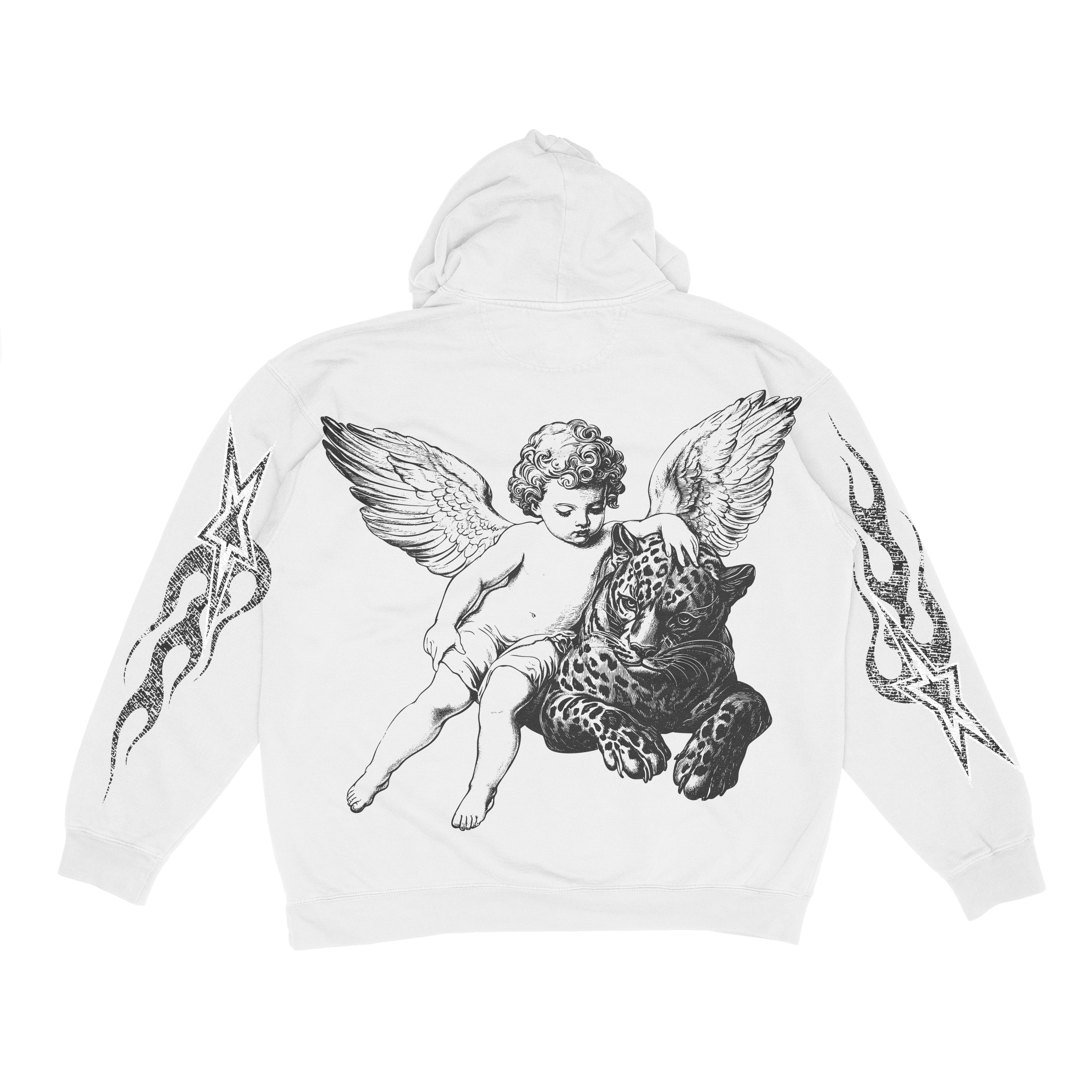 The Guardian Energy Hoodie from Vegas Print Collective blends classic art with modern streetwear edge. Featuring a detailed vintage cherub graphic across the back, this piece symbolizes strength, innocence, and divine protection — elevated with distressed star and flame sleeve graphics for that raw, urban finish.